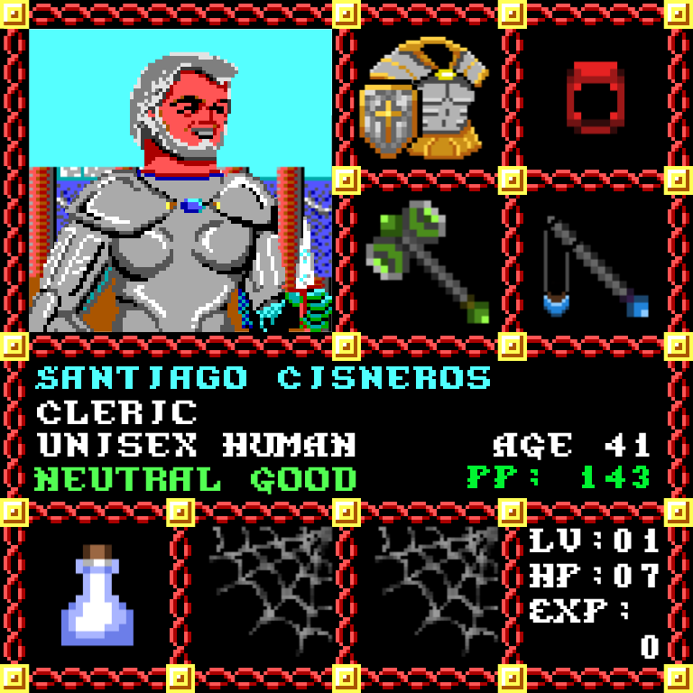 Santiago Cisneros is a Unisex Human, born to be a Cleric. Since their birth, for the last 41 years, their alignment has been Neutral Good and they have been honing their skills with the Hammer. They also carry the following: [Potion of Speed] > > > Santiago Cisneros is part of the Genesis Series of the Players Guild NFT Pool of Radiance Tribute.