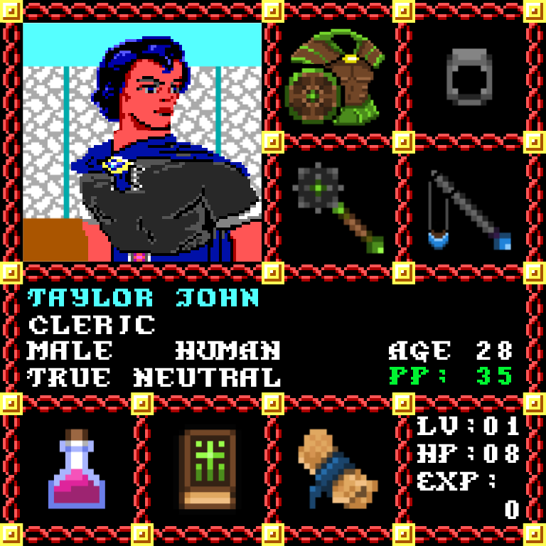 Taylor John is a Male Human, born to be a Cleric. Since his birth, for the last 28 years, his alignment has been True Neutral and he has been honing his skills with the Mace. He also carries the following: [Potion of Strength] [Phlan Journal Entries 1-15] [Scroll of Protection from Evil x80] > > > Taylor John is part of the Genesis Series of the Players Guild NFT Pool of Radiance Tribute.