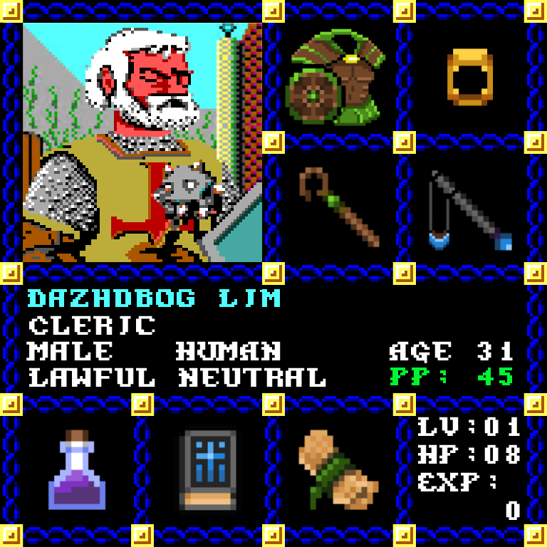 Dazhdbog Lim is a Male Human, born to be a Cleric. Since his birth, for the last 31 years, his alignment has been Lawful Neutral and he has been honing his skills with the Quarterstaff. He also carries the following: [Potion of Fire Resistance ] [Phlan Journal Entries 16-28] [Scroll of Cure Light Wounds x100] > > > Dazhdbog Lim is part of the Genesis Series of the Players Guild NFT Pool of Radiance Tribute.