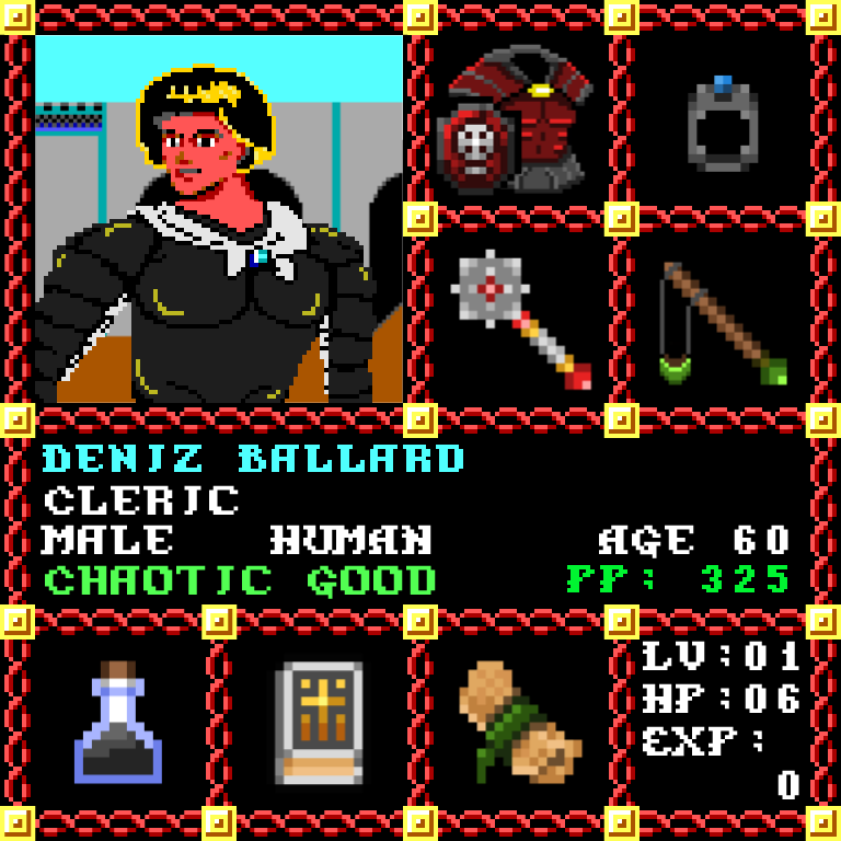 Deniz Ballard is a Male Human, born to be a Cleric. Since his birth, for the last 60 years, his alignment has been Chaotic Good and he has been honing his skills with the Mace +2. He also carries the following: [Potion of Invisibility ] [Phlan Journal Entries 29-40] [Scroll of Cure Light Wounds x100] > > > Deniz Ballard is part of the Genesis Series of the Players Guild NFT Pool of Radiance Tribute.