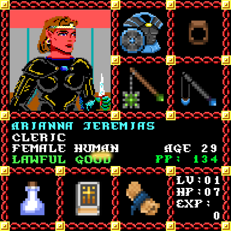 Arianna Jeremias is a Female Human, born to be a Cleric. Since her birth, for the last 29 years, her alignment has been Lawful Good and she has been honing her skills with the Flail. She also carries the following: [Potion of Speed] [Phlan Journal Entries 29-40] [Scroll of Protection from Evil x80] > > > Arianna Jeremias is part of the Genesis Series of the Players Guild NFT Pool of Radiance Tribute.