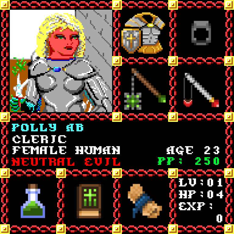 Polly Ab is a Female Human, born to be a Cleric. Since her birth, for the last 23 years, her alignment has been Neutral Evil and she has been honing her skills with the Flail. She also carries the following: [Potion of Healing ] [Phlan Journal Entries 1-15] [Scroll of Protection from Evil x80] > > > Polly Ab is part of the Genesis Series of the Players Guild NFT Pool of Radiance Tribute.