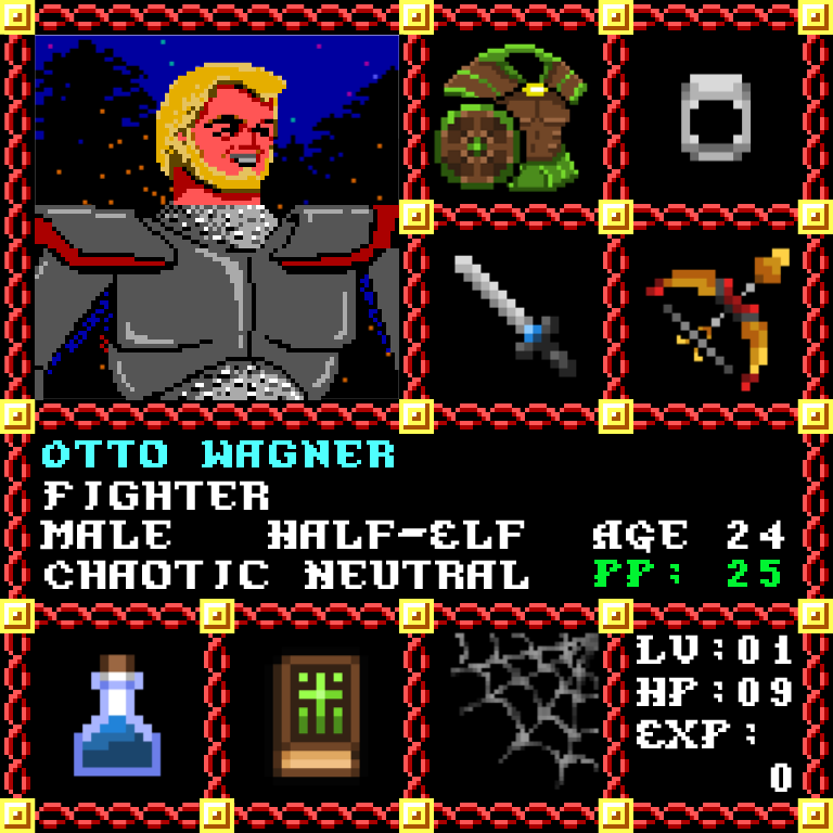 Otto Wagner is a Male Half-Elf, born to be a Fighter. Since his birth, for the last 24 years, his alignment has been Chaotic Neutral and he has been honing his skills with the Short Sword +1. He also carries the following: [Potion of Extra Healing ] [Phlan Journal Entries 1-15] > > > Otto Wagner is part of the Genesis Series of the Players Guild NFT Pool of Radiance Tribute.