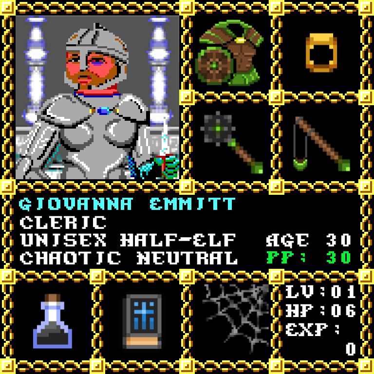 Giovanna Emmitt is a Unisex Half-Elf, born to be a Cleric. Since their birth, for the last 30 years, their alignment has been Chaotic Neutral and they have been honing their skills with the Mace. They also carry the following: [Potion of Invisibility ] [Phlan Journal Entries 16-28] > > > Giovanna Emmitt is part of the Genesis Series of the Players Guild NFT Pool of Radiance Tribute.