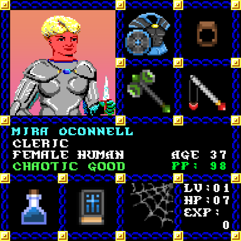 Mira Oconnell is a Female Human, born to be a Cleric. Since her birth, for the last 37 years, her alignment has been Chaotic Good and she has been honing her skills with the Hammer. She also carries the following: [Potion of Extra Healing ] [Phlan Journal Entries 16-28] > > > Mira Oconnell is part of the Genesis Series of the Players Guild NFT Pool of Radiance Tribute.