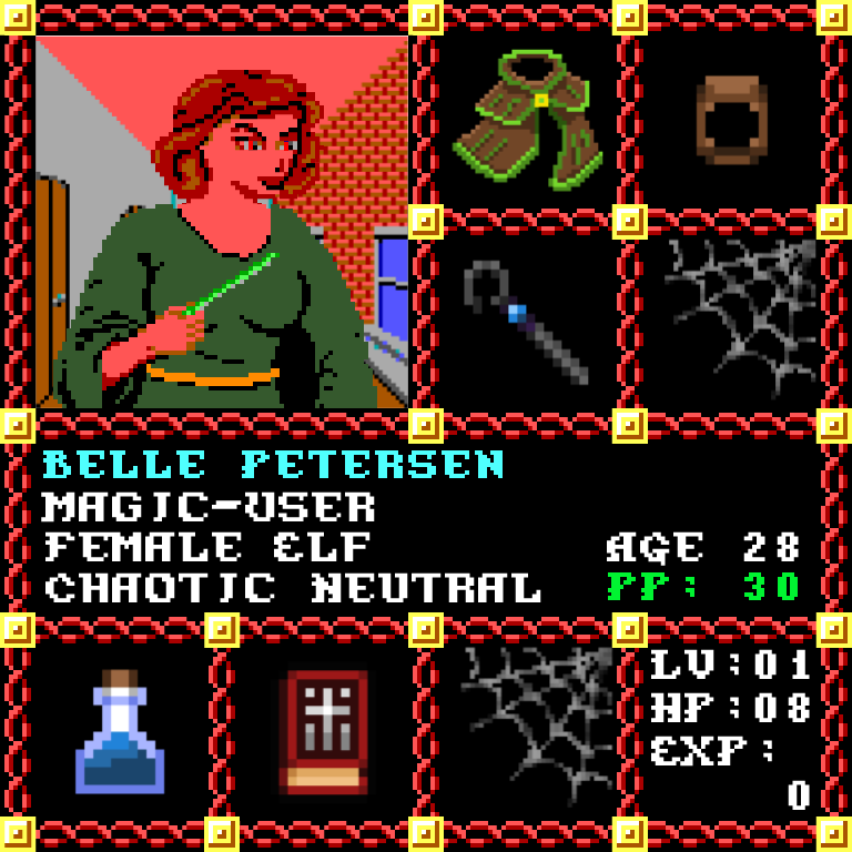 Belle Petersen is a Female Elf, born to be a Magic-User. Since her birth, for the last 28 years, her alignment has been Chaotic Neutral and she has been honing her skills with the Quarterstaff +1. She also carries the following: [Potion of Extra Healing ] [Phlan Journal Entries 51-58] > > > Belle Petersen is part of the Genesis Series of the Players Guild NFT Pool of Radiance Tribute.