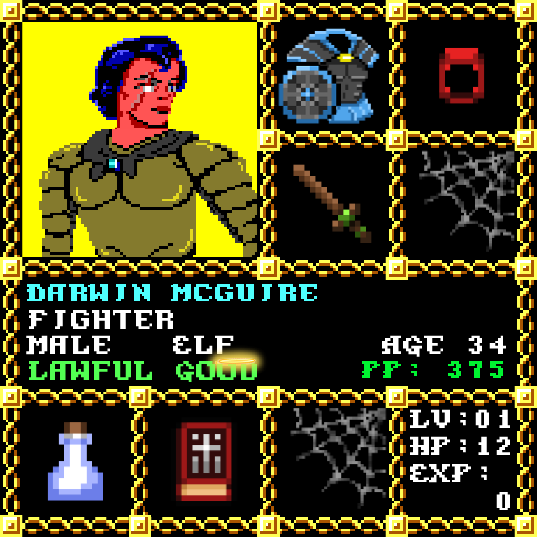 Darwin Mcguire is a Male Elf, born to be a Fighter. Since his birth, for the last 34 years, his alignment has been Lawful Good and he has been honing his skills with the Short Sword. He also carries the following: [Potion of Speed] [Phlan Journal Entries 51-58] > > > Darwin Mcguire is part of the Genesis Series of the Players Guild NFT Pool of Radiance Tribute.