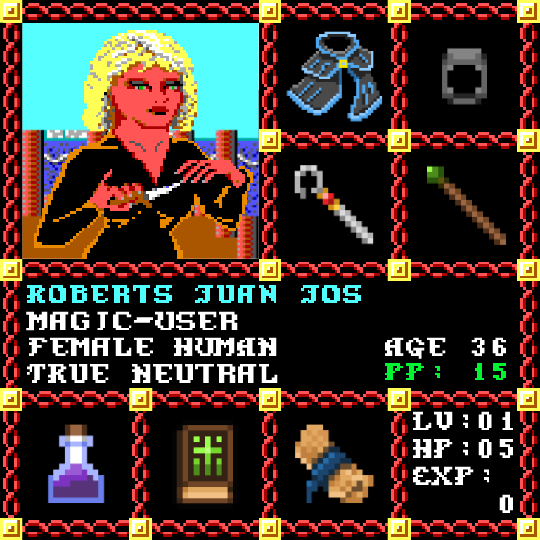 Roberts Juan Jose is a Female Human, born to be a Magic-User. Since her birth, for the last 36 years, her alignment has been True Neutral and she has been honing her skills with the Quarterstaff +2. She also carries the following: [Potion of Fire Resistance ] [Phlan Journal Entries 1-15] [Scroll of Haste x50] > > > Roberts Juan Jose is part of the Genesis Series of the Players Guild NFT Pool of Radiance Tribute.