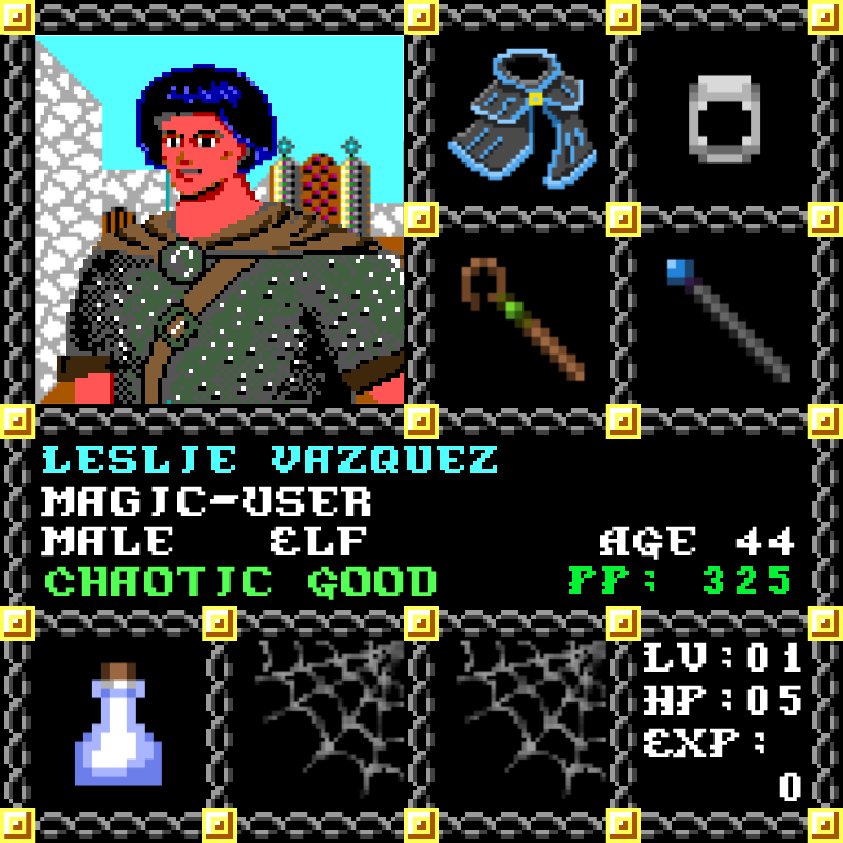 Leslie Vazquez is a Male Elf, born to be a Magic-User. Since his birth, for the last 44 years, his alignment has been Chaotic Good and he has been honing his skills with the Quarterstaff. He also carries the following: [Potion of Speed] > > > Leslie Vazquez is part of the Genesis Series of the Players Guild NFT Pool of Radiance Tribute.