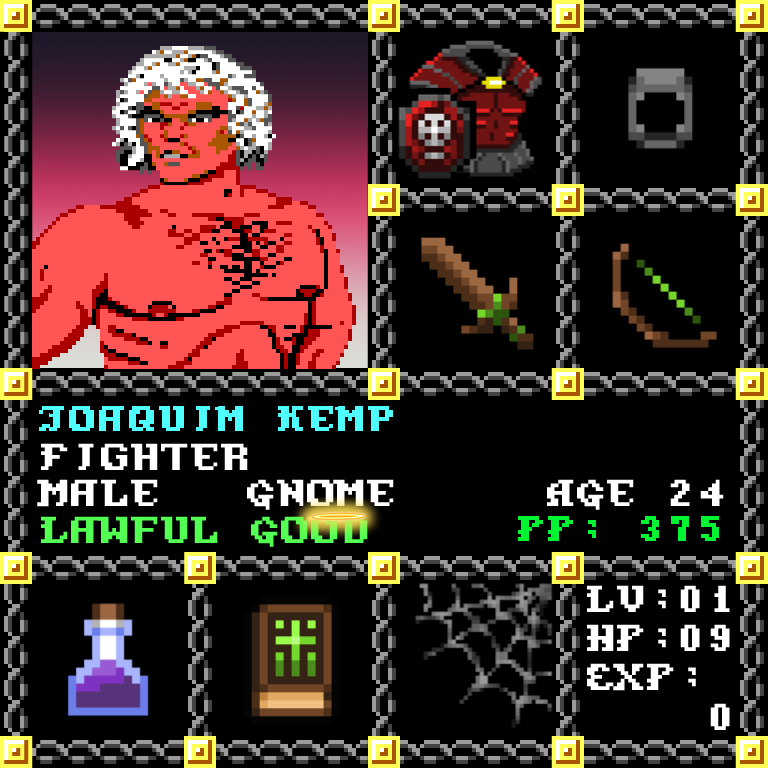Joaquim Kemp is a Male Gnome, born to be a Fighter. Since his birth, for the last 24 years, his alignment has been Lawful Good and he has been honing his skills with the Broadsword. He also carries the following: [Potion of Fire Resistance ] [Phlan Journal Entries 1-15] > > > Joaquim Kemp is part of the Genesis Series of the Players Guild NFT Pool of Radiance Tribute.