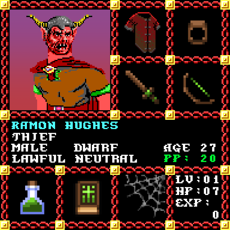 Ramon Hughes is a Male Dwarf, born to be a Thief. Since his birth, for the last 27 years, his alignment has been Lawful Neutral and he has been honing his skills with the Short Sword. He also carries the following: [Potion of Healing ] [Phlan Journal Entries 1-15] > > > Ramon Hughes is part of the Genesis Series of the Players Guild NFT Pool of Radiance Tribute.