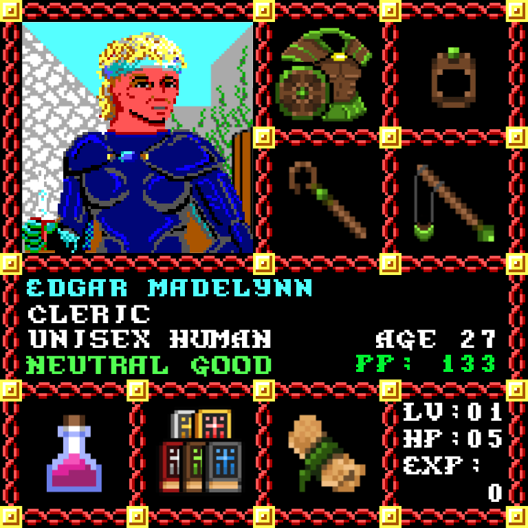 Edgar Madelynn is a Unisex Human, born to be a Cleric. Since their birth, for the last 27 years, their alignment has been Neutral Good and they have been honing their skills with the Quarterstaff. They also carry the following: [Potion of Strength] [Phlan Journal Entries Complete] [Scroll of Cure Light Wounds x100] > > > Edgar Madelynn is part of the Genesis Series of the Players Guild NFT Pool of Radiance Tribute.