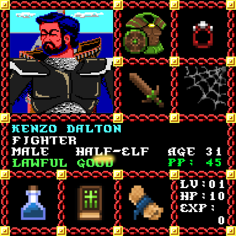 Kenzo Dalton is a Male Half-Elf, born to be a Fighter. Since his birth, for the last 31 years, his alignment has been Lawful Good and he has been honing his skills with the Broadsword. He also carries the following: [Potion of Extra Healing ] [Phlan Journal Entries 1-15] [Scroll of Haste x50] > > > Kenzo Dalton is part of the Genesis Series of the Players Guild NFT Pool of Radiance Tribute.