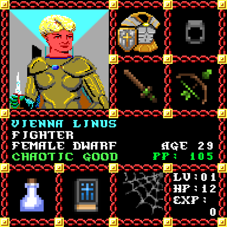 Vienna Linus is a Female Dwarf, born to be a Fighter. Since her birth, for the last 29 years, her alignment has been Chaotic Good and she has been honing her skills with the Short Sword. She also carries the following: [Potion of Speed] [Phlan Journal Entries 16-28] > > > Vienna Linus is part of the Genesis Series of the Players Guild NFT Pool of Radiance Tribute.