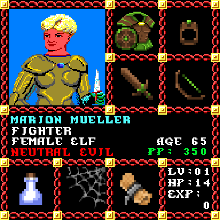 Marion Mueller is a Female Elf, born to be a Fighter. Since her birth, for the last 65 years, her alignment has been Neutral Evil and she has been honing her skills with the Broadsword. She also carries the following: [Potion of Speed] [Scroll of Hold Person x50] > > > Marion Mueller is part of the Genesis Series of the Players Guild NFT Pool of Radiance Tribute.