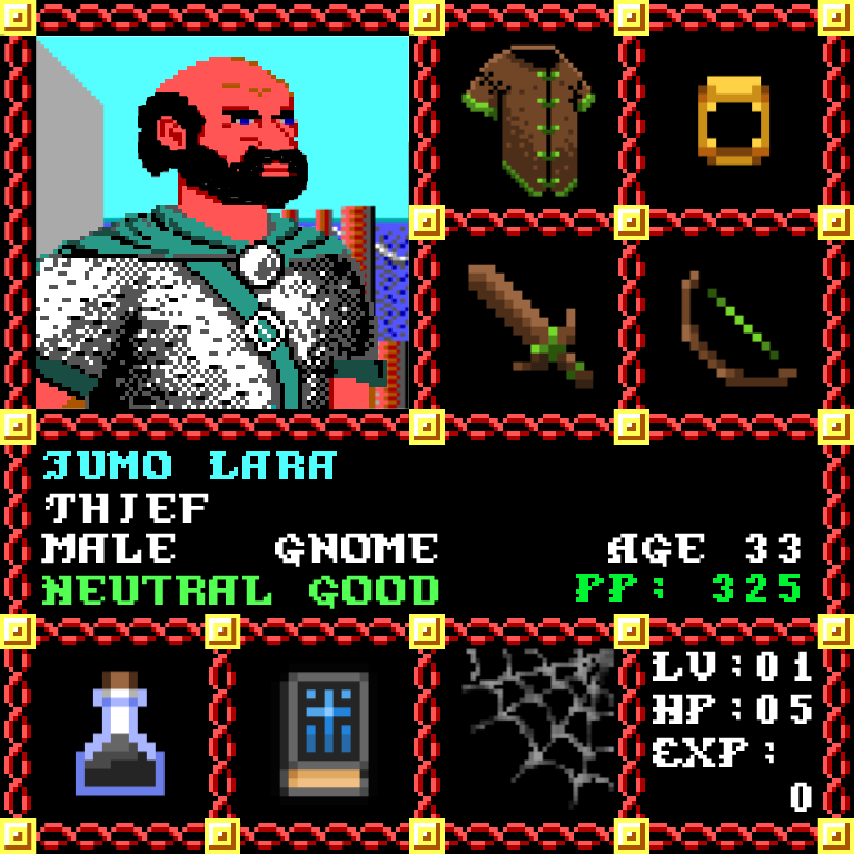 Jumo Lara is a Male Gnome, born to be a Thief. Since his birth, for the last 33 years, his alignment has been Neutral Good and he has been honing his skills with the Broadsword. He also carries the following: [Potion of Invisibility ] [Phlan Journal Entries 16-28] > > > Jumo Lara is part of the Genesis Series of the Players Guild NFT Pool of Radiance Tribute.
