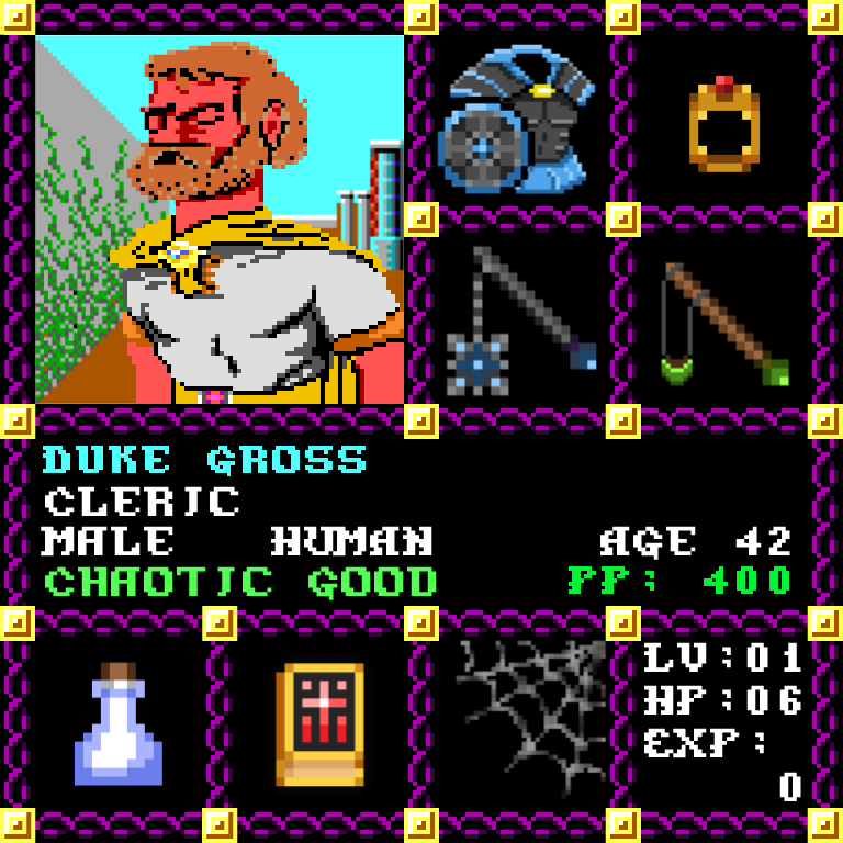 Duke Gross is a Male Human, born to be a Cleric. Since his birth, for the last 42 years, his alignment has been Chaotic Good and he has been honing his skills with the Flail +1. He also carries the following: [Potion of Speed] [Phlan Journal Entries 41-50] > > > Duke Gross is part of the Genesis Series of the Players Guild NFT Pool of Radiance Tribute.