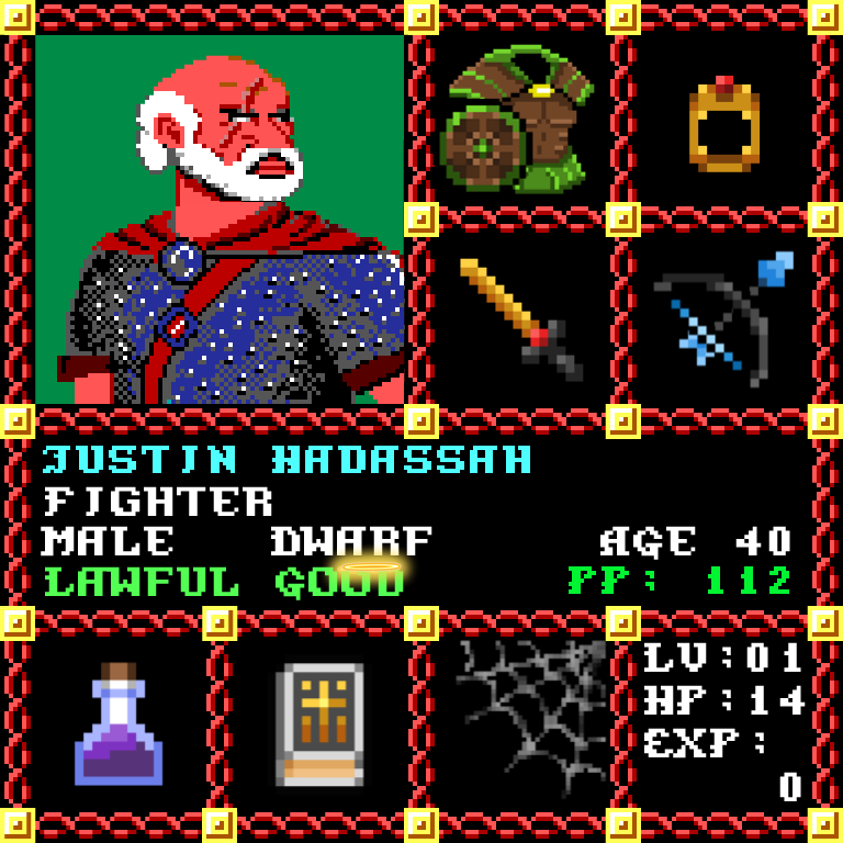 Justin Hadassah is a Male Dwarf, born to be a Fighter. Since his birth, for the last 40 years, his alignment has been Lawful Good and he has been honing his skills with the Short Sword +3. He also carries the following: [Potion of Fire Resistance ] [Phlan Journal Entries 29-40] > > > Justin Hadassah is part of the Genesis Series of the Players Guild NFT Pool of Radiance Tribute.