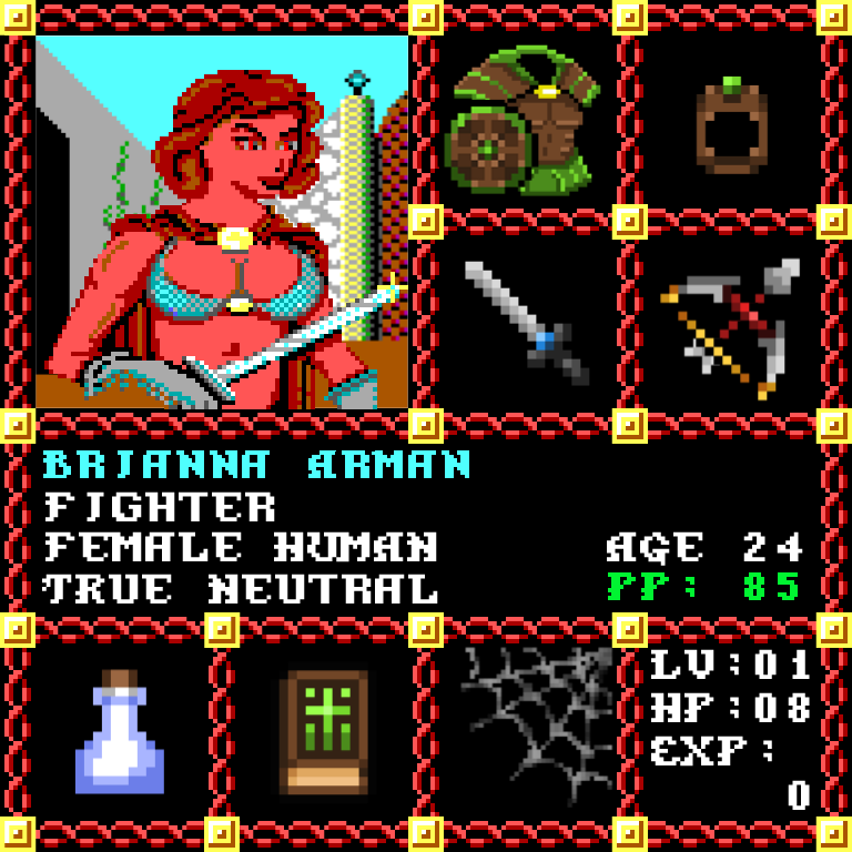 Brianna Arman is a Female Human, born to be a Fighter. Since her birth, for the last 24 years, her alignment has been True Neutral and she has been honing her skills with the Short Sword +1. She also carries the following: [Potion of Speed] [Phlan Journal Entries 1-15] > > > Brianna Arman is part of the Genesis Series of the Players Guild NFT Pool of Radiance Tribute.