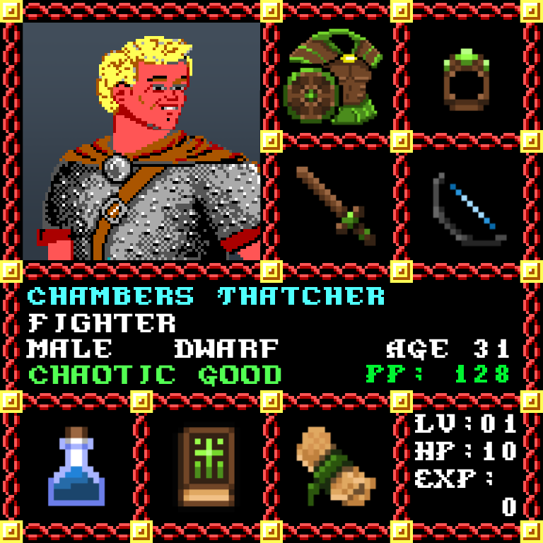 Chambers Thatcher is a Male Dwarf, born to be a Fighter. Since his birth, for the last 31 years, his alignment has been Chaotic Good and he has been honing his skills with the Short Sword. He also carries the following: [Potion of Extra Healing ] [Phlan Journal Entries 1-15] [Scroll of Cure Light Wounds x100] > > > Chambers Thatcher is part of the Genesis Series of the Players Guild NFT Pool of Radiance Tribute.