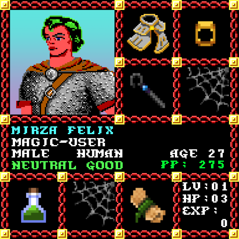 Mirza Felix is a Male Human, born to be a Magic-User. Since his birth, for the last 27 years, his alignment has been Neutral Good and he has been honing his skills with the Quarterstaff +1. He also carries the following: [Potion of Healing ] [Scroll of Sleep x50] > > > Mirza Felix is part of the Genesis Series of the Players Guild NFT Pool of Radiance Tribute.