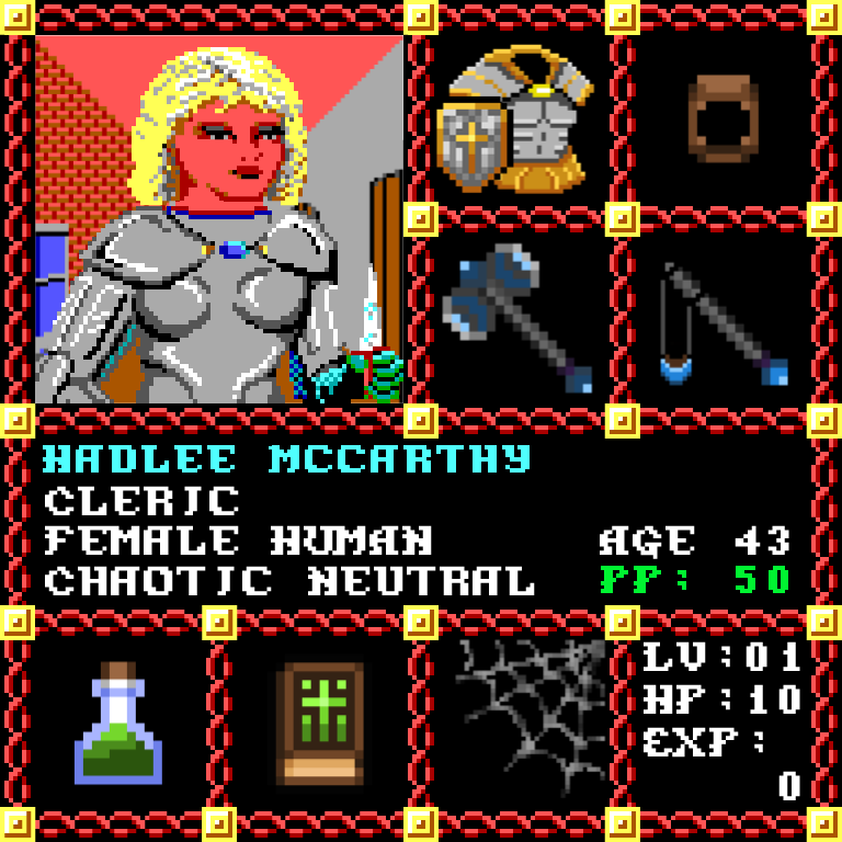Hadlee Mccarthy is a Female Human, born to be a Cleric. Since her birth, for the last 43 years, her alignment has been Chaotic Neutral and she has been honing her skills with the Hammer +1. She also carries the following: [Potion of Healing ] [Phlan Journal Entries 1-15] > > > Hadlee Mccarthy is part of the Genesis Series of the Players Guild NFT Pool of Radiance Tribute.