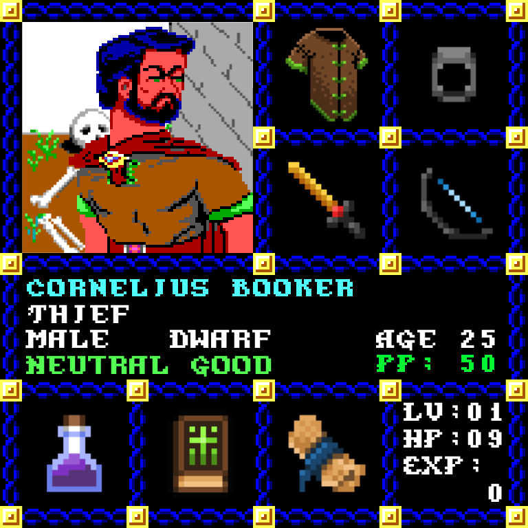 Cornelius Booker is a Male Dwarf, born to be a Thief. Since his birth, for the last 25 years, his alignment has been Neutral Good and he has been honing his skills with the Short Sword +3. He also carries the following: [Potion of Fire Resistance ] [Phlan Journal Entries 1-15] [Scroll of Haste x50] > > > Cornelius Booker is part of the Genesis Series of the Players Guild NFT Pool of Radiance Tribute.