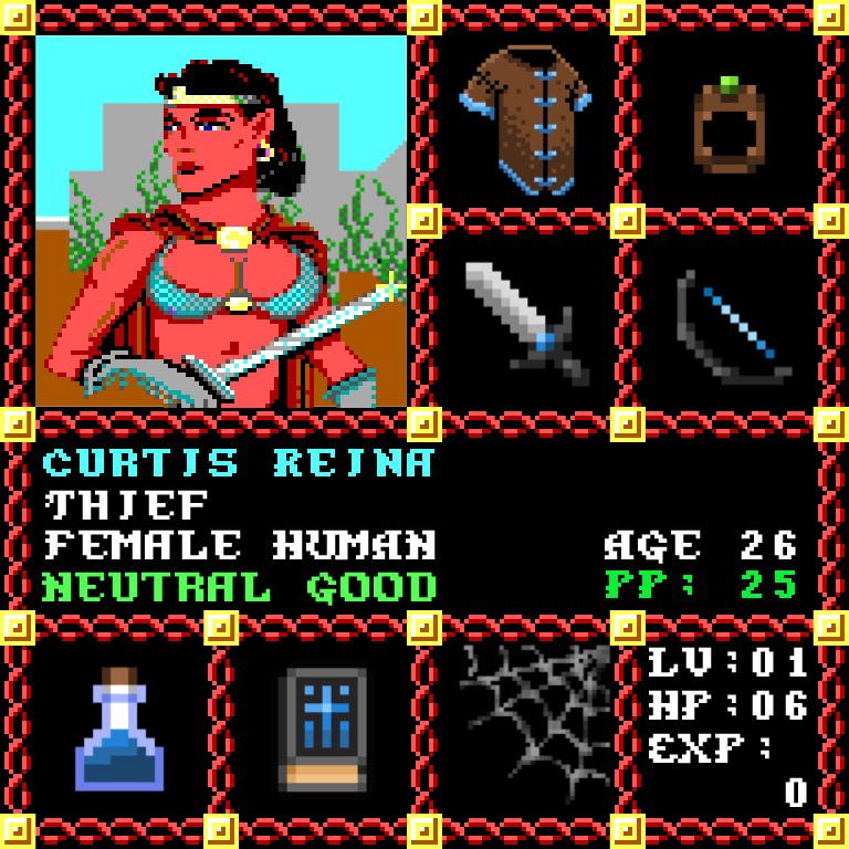 Curtis Reina is a Female Human, born to be a Thief. Since her birth, for the last 26 years, her alignment has been Neutral Good and she has been honing her skills with the Broadsword +2. She also carries the following: [Potion of Extra Healing ] [Phlan Journal Entries 16-28] > > > Curtis Reina is part of the Genesis Series of the Players Guild NFT Pool of Radiance Tribute.