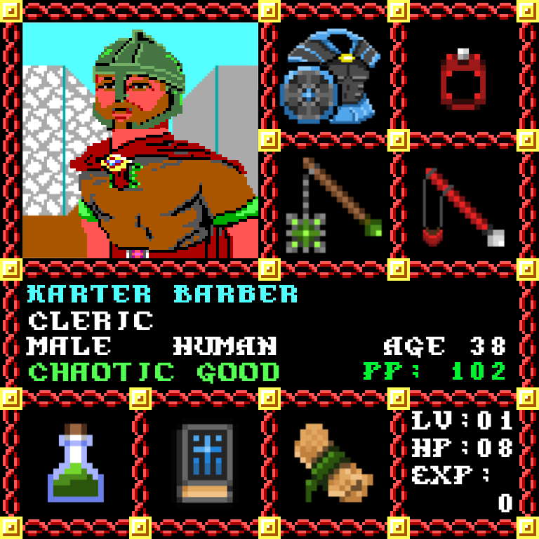 Karter Barber is a Male Human, born to be a Cleric. Since his birth, for the last 38 years, his alignment has been Chaotic Good and he has been honing his skills with the Flail. He also carries the following: [Potion of Healing ] [Phlan Journal Entries 16-28] [Scroll of Cure Light Wounds x100] > > > Karter Barber is part of the Genesis Series of the Players Guild NFT Pool of Radiance Tribute.