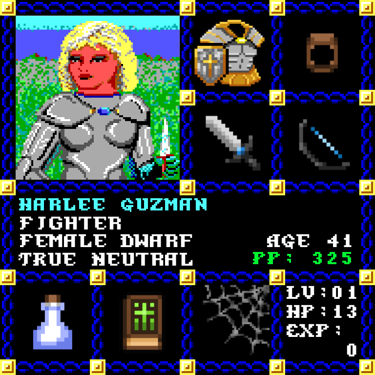 Harlee Guzman is a Female Dwarf, born to be a Fighter. Since her birth, for the last 41 years, her alignment has been True Neutral and she has been honing her skills with the Broadsword +2. She also carries the following: [Potion of Speed] [Phlan Journal Entries 1-15] > > > Harlee Guzman is part of the Genesis Series of the Players Guild NFT Pool of Radiance Tribute.