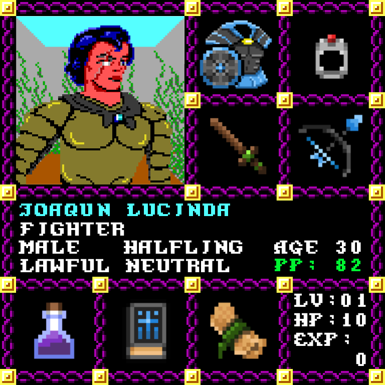 Joaquin Lucinda is a Male Halfling, born to be a Fighter. Since his birth, for the last 30 years, his alignment has been Lawful Neutral and he has been honing his skills with the Short Sword. He also carries the following: [Potion of Fire Resistance ] [Phlan Journal Entries 16-28] [Scroll of Sleep x50] > > > Joaquin Lucinda is part of the Genesis Series of the Players Guild NFT Pool of Radiance Tribute.