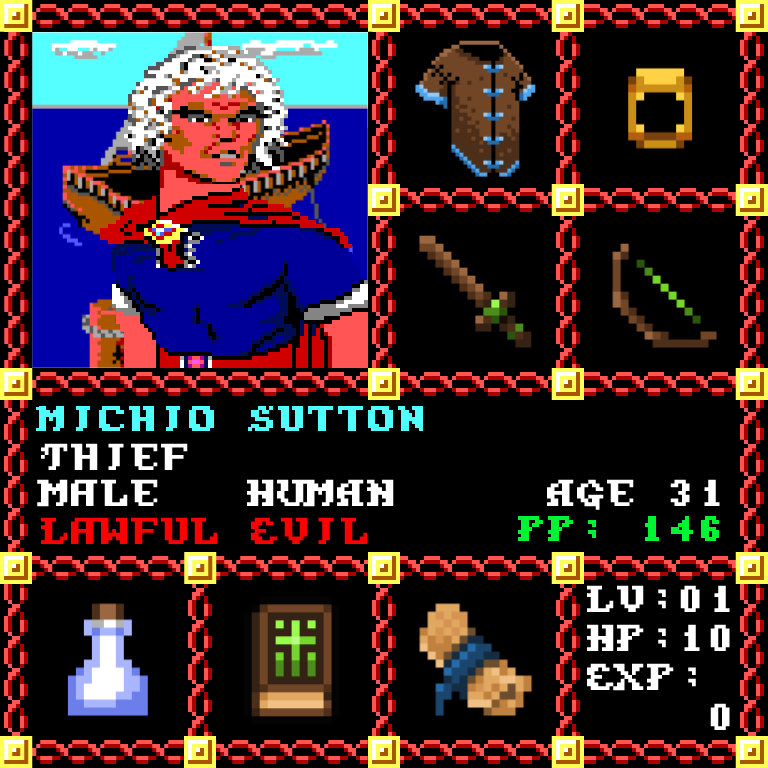 Michio Sutton is a Male Human, born to be a Thief. Since his birth, for the last 31 years, his alignment has been Lawful Evil and he has been honing his skills with the Short Sword. He also carries the following: [Potion of Speed] [Phlan Journal Entries 1-15] [Scroll of Haste x50] > > > Michio Sutton is part of the Genesis Series of the Players Guild NFT Pool of Radiance Tribute.