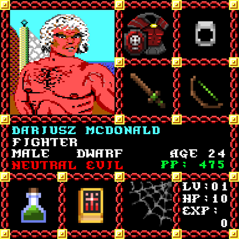 Dariusz Mcdonald is a Male Dwarf, born to be a Fighter. Since his birth, for the last 24 years, his alignment has been Neutral Evil and he has been honing his skills with the Short Sword. He also carries the following: [Potion of Healing ] [Phlan Journal Entries 41-50] > > > Dariusz Mcdonald is part of the Genesis Series of the Players Guild NFT Pool of Radiance Tribute.
