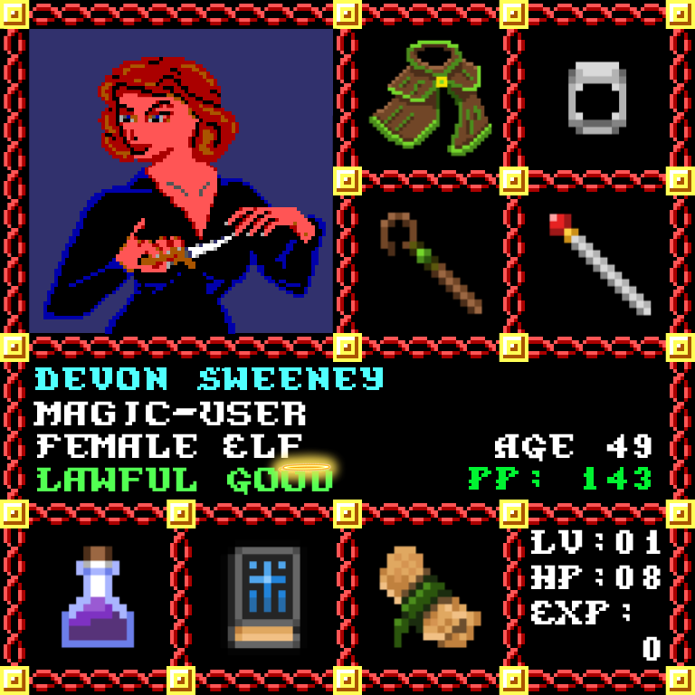 Devon Sweeney is a Female Elf, born to be a Magic-User. Since her birth, for the last 49 years, her alignment has been Lawful Good and she has been honing her skills with the Quarterstaff. She also carries the following: [Potion of Fire Resistance ] [Phlan Journal Entries 16-28] [Scroll of Sleep x50] > > > Devon Sweeney is part of the Genesis Series of the Players Guild NFT Pool of Radiance Tribute.