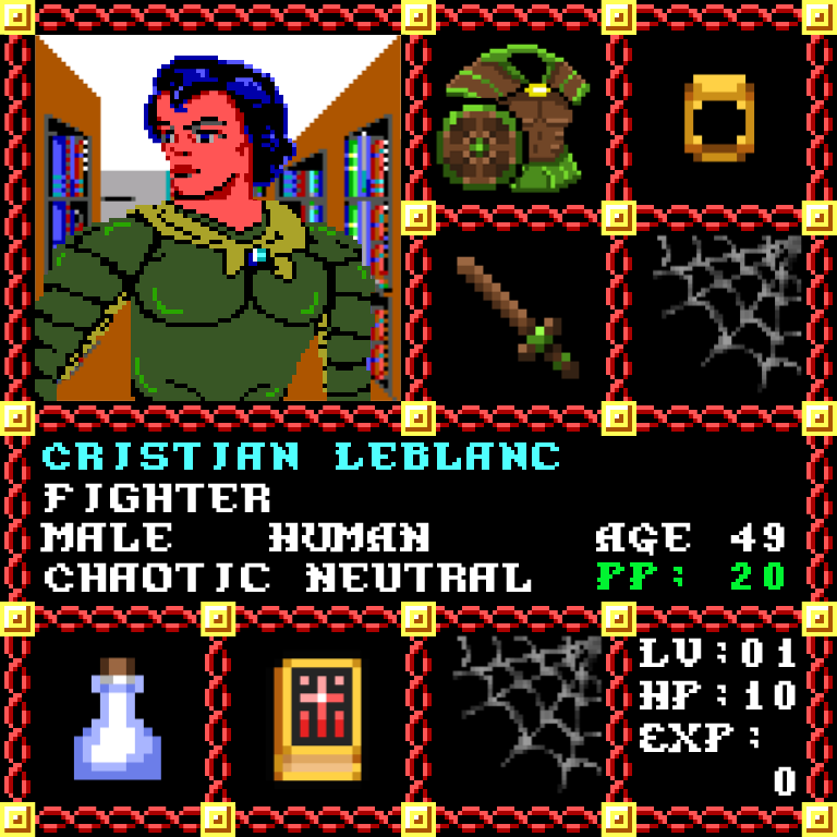 Cristian Leblanc is a Male Human, born to be a Fighter. Since his birth, for the last 49 years, his alignment has been Chaotic Neutral and he has been honing his skills with the Short Sword. He also carries the following: [Potion of Speed] [Phlan Journal Entries 41-50] > > > Cristian Leblanc is part of the Genesis Series of the Players Guild NFT Pool of Radiance Tribute.