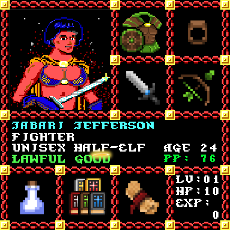 Jabari Jefferson is a Unisex Half-Elf, born to be a Fighter. Since their birth, for the last 24 years, their alignment has been Lawful Good and they have been honing their skills with the Broadsword +2. They also carry the following: [Potion of Speed] [Phlan Journal Entries Complete] [Scroll of Bestow Curse x50] > > > Jabari Jefferson is part of the Genesis Series of the Players Guild NFT Pool of Radiance Tribute.