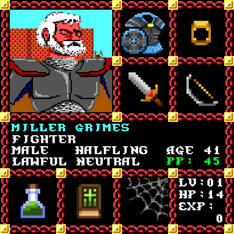 Miller Grimes is a Male Halfling, born to be a Fighter. Since his birth, for the last 41 years, his alignment has been Lawful Neutral and he has been honing his skills with the Broadsword +4. He also carries the following: [Potion of Healing ] [Phlan Journal Entries 1-15] > > > Miller Grimes is part of the Genesis Series of the Players Guild NFT Pool of Radiance Tribute.