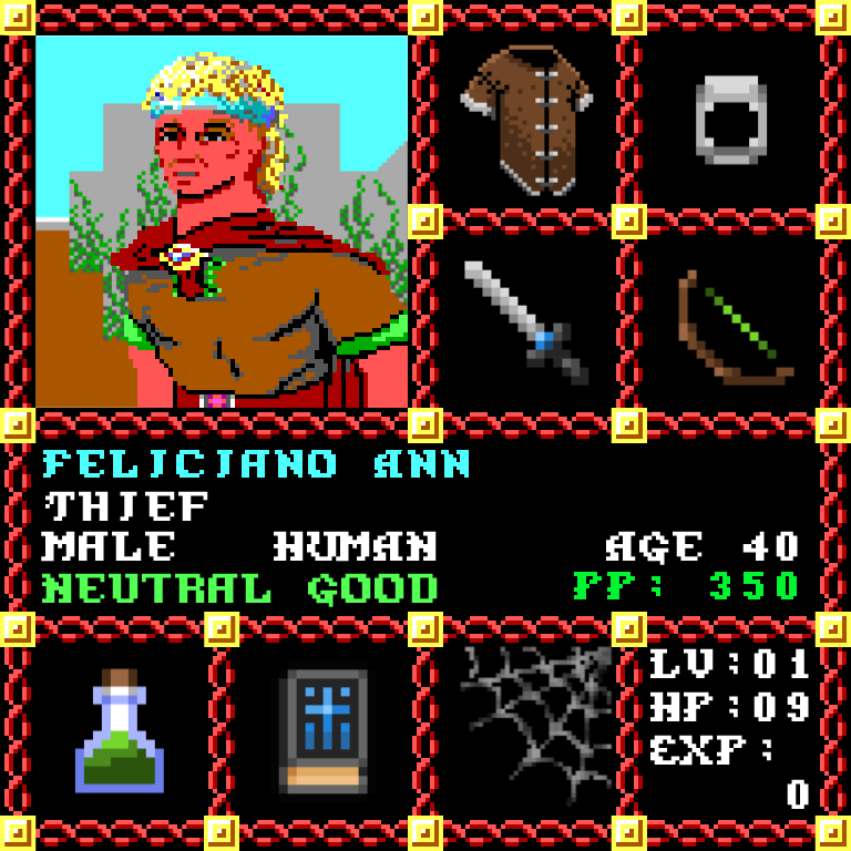 Feliciano Ann is a Male Human, born to be a Thief. Since his birth, for the last 40 years, his alignment has been Neutral Good and he has been honing his skills with the Short Sword +1. He also carries the following: [Potion of Healing ] [Phlan Journal Entries 16-28] > > > Feliciano Ann is part of the Genesis Series of the Players Guild NFT Pool of Radiance Tribute.