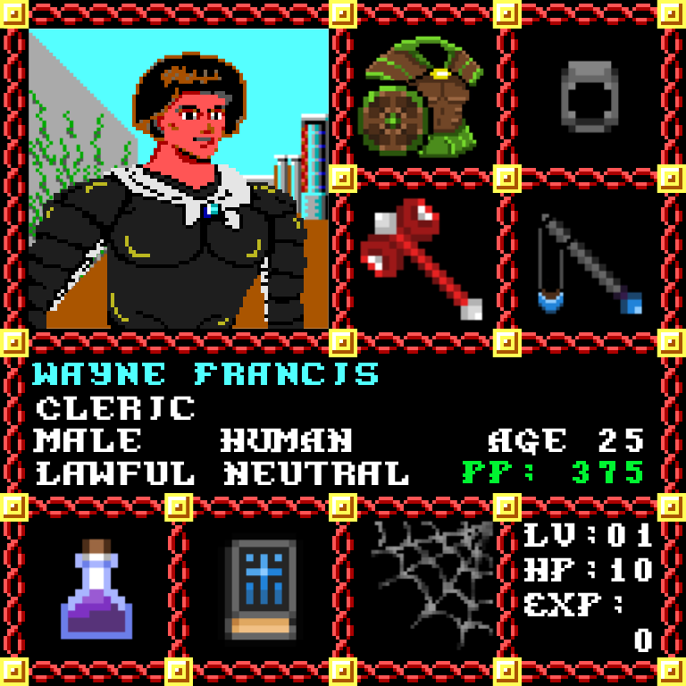 Wayne Francis is a Male Human, born to be a Cleric. Since his birth, for the last 25 years, his alignment has been Lawful Neutral and he has been honing his skills with the Hammer Cursed. He also carries the following: [Potion of Fire Resistance ] [Phlan Journal Entries 16-28] > > > Wayne Francis is part of the Genesis Series of the Players Guild NFT Pool of Radiance Tribute.