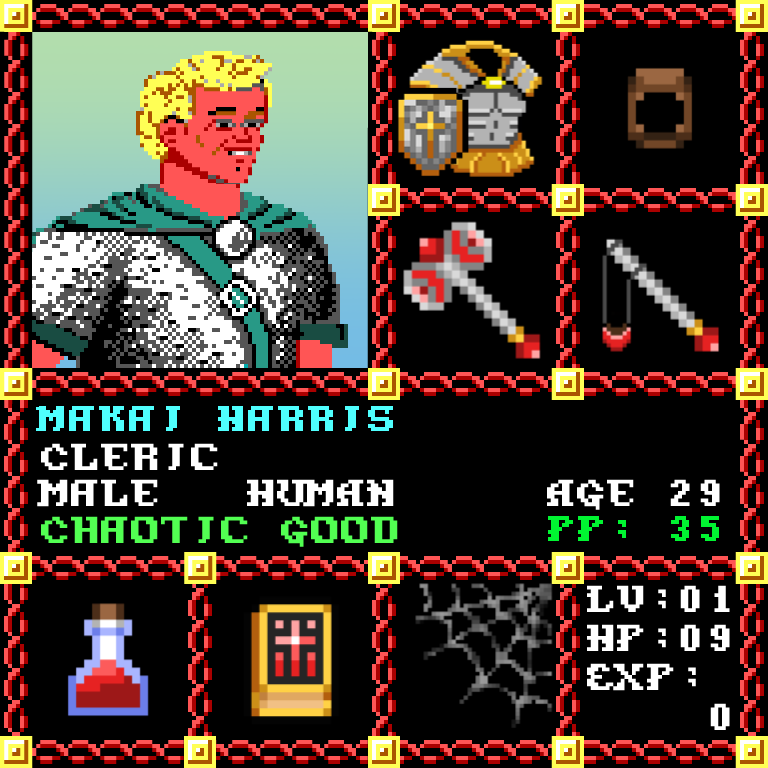 Makai Harris is a Male Human, born to be a Cleric. Since his birth, for the last 29 years, his alignment has been Chaotic Good and he has been honing his skills with the Hammer +2. He also carries the following: [Potion of Poison ] [Phlan Journal Entries 41-50] > > > Makai Harris is part of the Genesis Series of the Players Guild NFT Pool of Radiance Tribute.