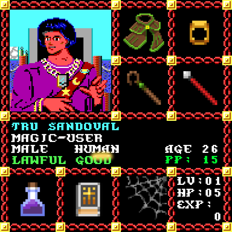 Tru Sandoval is a Male Human, born to be a Magic-User. Since his birth, for the last 26 years, his alignment has been Lawful Good and he has been honing his skills with the Quarterstaff. He also carries the following: [Potion of Fire Resistance ] [Phlan Journal Entries 29-40] > > > Tru Sandoval is part of the Genesis Series of the Players Guild NFT Pool of Radiance Tribute.