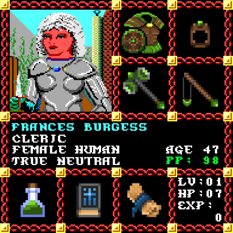 Frances Burgess is a Female Human, born to be a Cleric. Since her birth, for the last 47 years, her alignment has been True Neutral and she has been honing her skills with the Hammer. She also carries the following: [Potion of Healing ] [Phlan Journal Entries 16-28] [Scroll of Protection from Evil x80] > > > Frances Burgess is part of the Genesis Series of the Players Guild NFT Pool of Radiance Tribute.