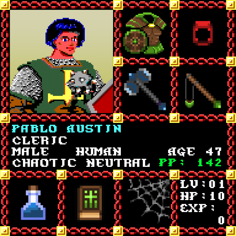 Pablo Austin is a Male Human, born to be a Cleric. Since his birth, for the last 47 years, his alignment has been Chaotic Neutral and he has been honing his skills with the Hammer +1. He also carries the following: [Potion of Extra Healing ] [Phlan Journal Entries 1-15] > > > Pablo Austin is part of the Genesis Series of the Players Guild NFT Pool of Radiance Tribute.