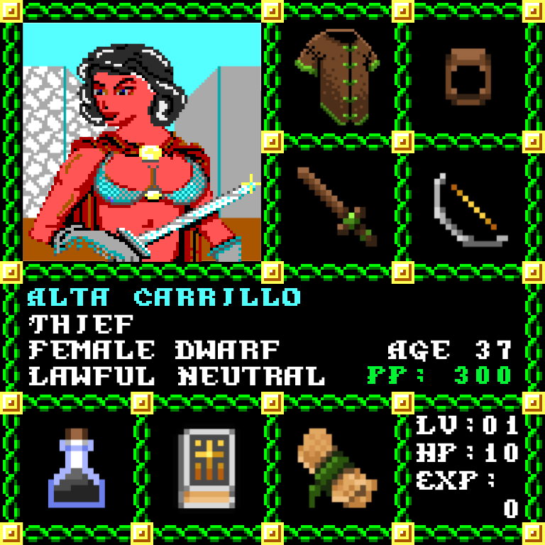 Alta Carrillo is a Female Dwarf, born to be a Thief. Since her birth, for the last 37 years, her alignment has been Lawful Neutral and she has been honing her skills with the Short Sword. She also carries the following: [Potion of Invisibility ] [Phlan Journal Entries 29-40] [Scroll of Sleep x50] > > > Alta Carrillo is part of the Genesis Series of the Players Guild NFT Pool of Radiance Tribute.