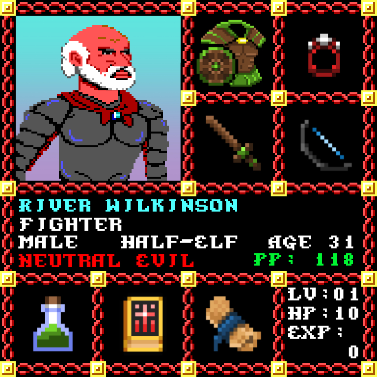 River Wilkinson is a Male Half-Elf, born to be a Fighter. Since his birth, for the last 31 years, his alignment has been Neutral Evil and he has been honing his skills with the Short Sword. He also carries the following: [Potion of Healing ] [Phlan Journal Entries 41-50] [Scroll of Haste x50] > > > River Wilkinson is part of the Genesis Series of the Players Guild NFT Pool of Radiance Tribute.