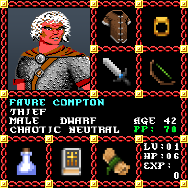 Favre Compton is a Male Dwarf, born to be a Thief. Since his birth, for the last 42 years, his alignment has been Chaotic Neutral and he has been honing his skills with the Broadsword +2. He also carries the following: [Potion of Speed] [Phlan Journal Entries 29-40] [Scroll of Sleep x50] > > > Favre Compton is part of the Genesis Series of the Players Guild NFT Pool of Radiance Tribute.
