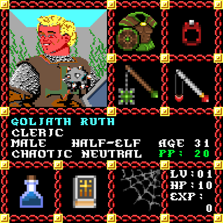 Goliath Ruth is a Male Half-Elf, born to be a Cleric. Since his birth, for the last 31 years, his alignment has been Chaotic Neutral and he has been honing his skills with the Flail. He also carries the following: [Potion of Extra Healing ] [Phlan Journal Entries 29-40] > > > Goliath Ruth is part of the Genesis Series of the Players Guild NFT Pool of Radiance Tribute.