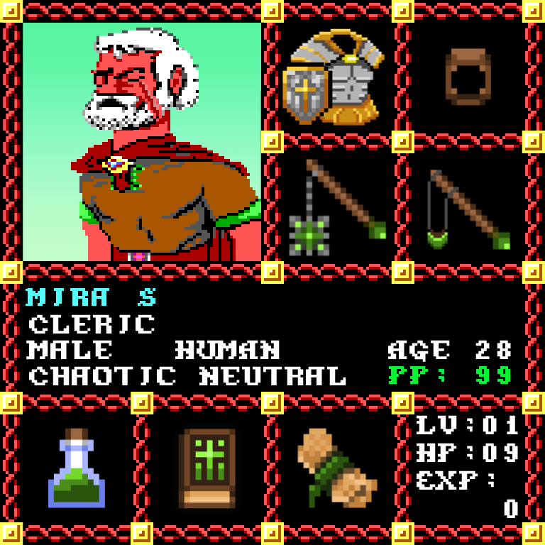 Mirac S is a Male Human, born to be a Cleric. Since his birth, for the last 28 years, his alignment has been Chaotic Neutral and he has been honing his skills with the Flail. He also carries the following: [Potion of Healing ] [Phlan Journal Entries 1-15] [Scroll of Cure Light Wounds x100] > > > Mirac S is part of the Genesis Series of the Players Guild NFT Pool of Radiance Tribute.