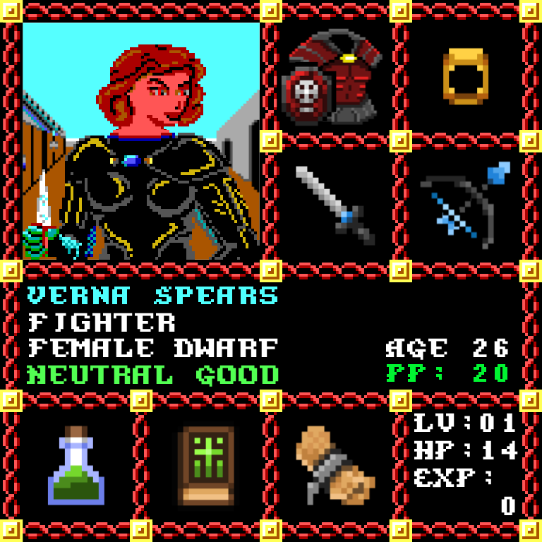 Verna Spears is a Female Dwarf, born to be a Fighter. Since her birth, for the last 26 years, her alignment has been Neutral Good and she has been honing her skills with the Short Sword +1. She also carries the following: [Potion of Healing ] [Phlan Journal Entries 1-15] [Scroll of Hold Person x50] > > > Verna Spears is part of the Genesis Series of the Players Guild NFT Pool of Radiance Tribute.