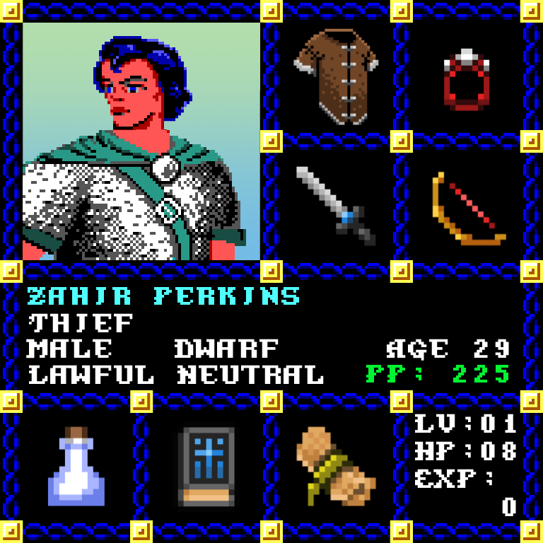 Zahir Perkins is a Male Dwarf, born to be a Thief. Since his birth, for the last 29 years, his alignment has been Lawful Neutral and he has been honing his skills with the Short Sword +1. He also carries the following: [Potion of Speed] [Phlan Journal Entries 16-28] [Scroll of Lightning Bolt x50] > > > Zahir Perkins is part of the Genesis Series of the Players Guild NFT Pool of Radiance Tribute.